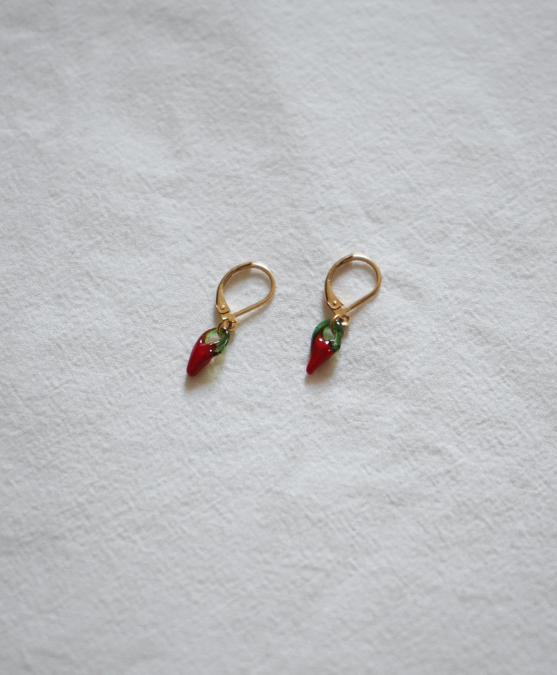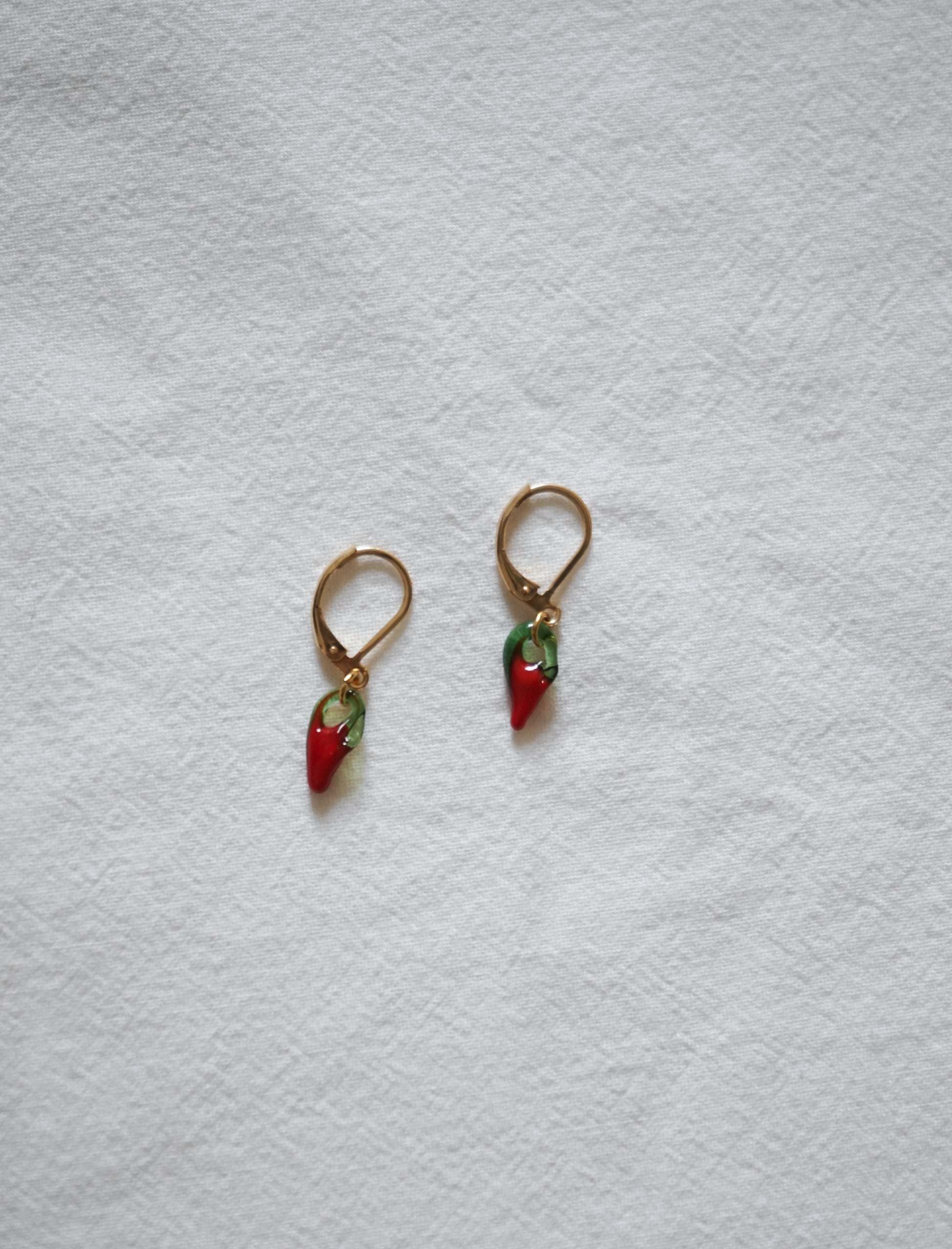 Boucles d’oreilles dormeuses avec un pendentif piment en verre.