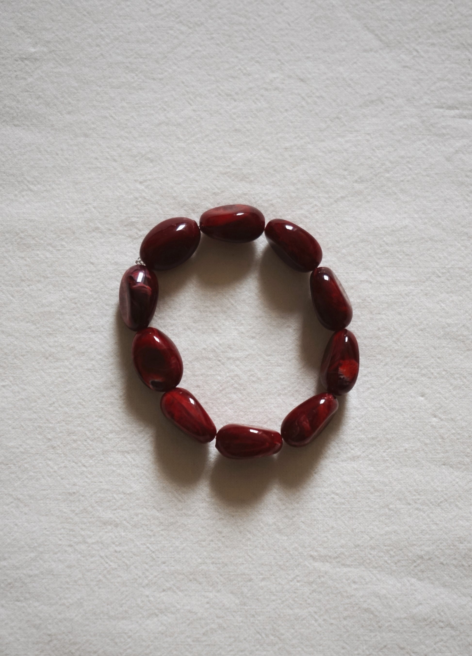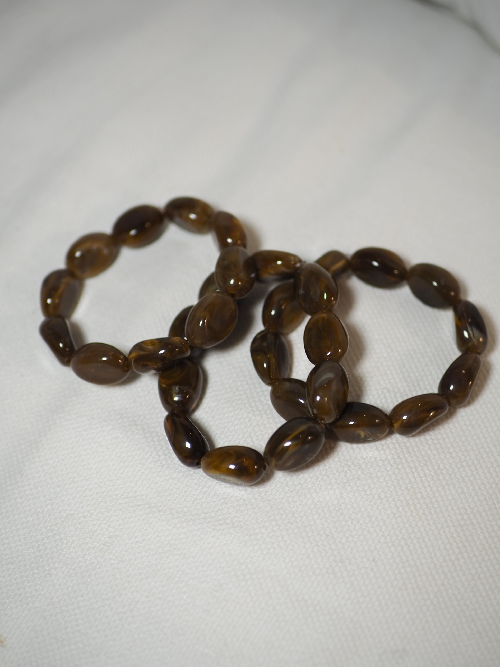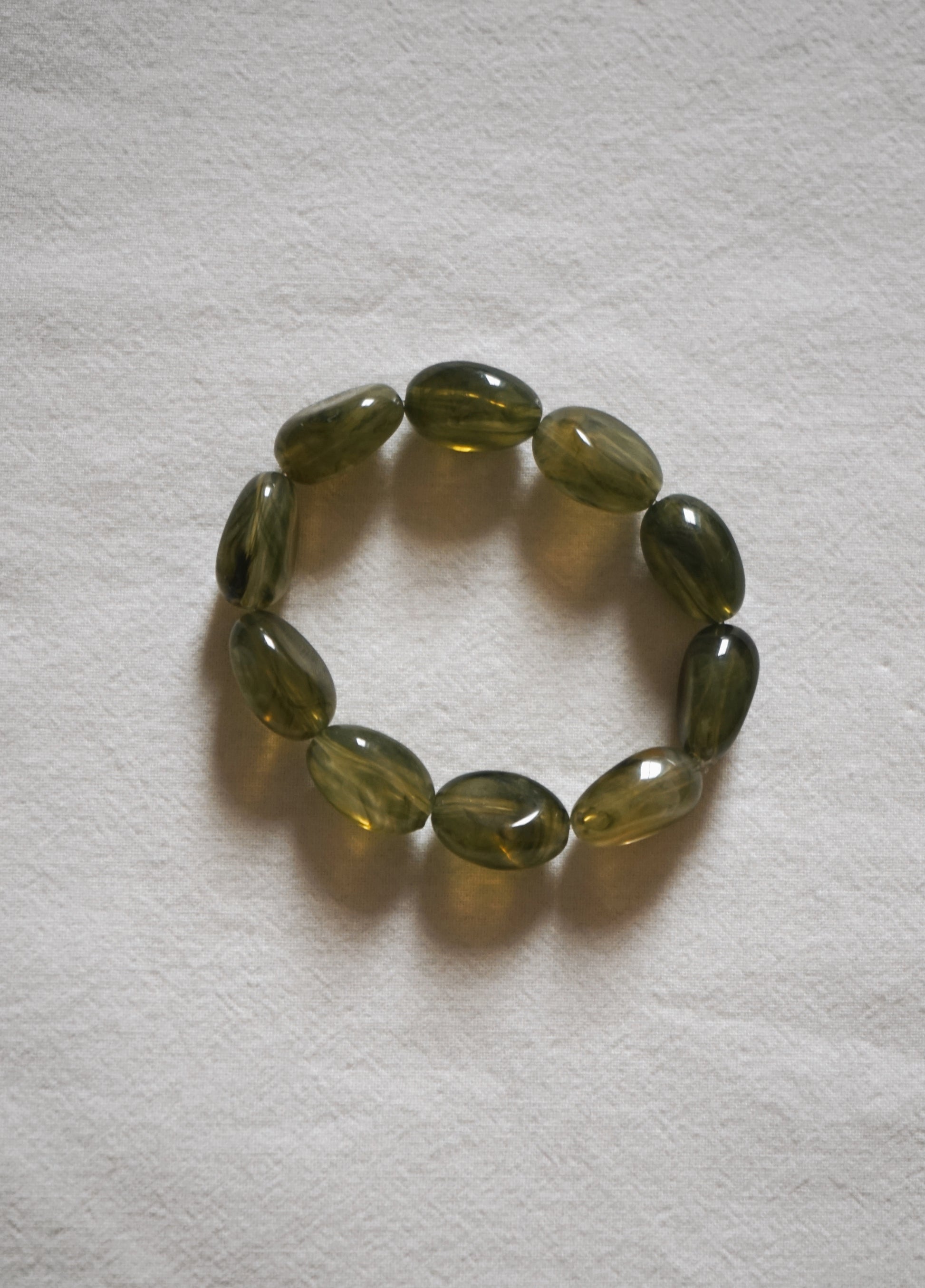 Bracelet avec des perles en acrylique en forme de galets monté sur un fil élastique.