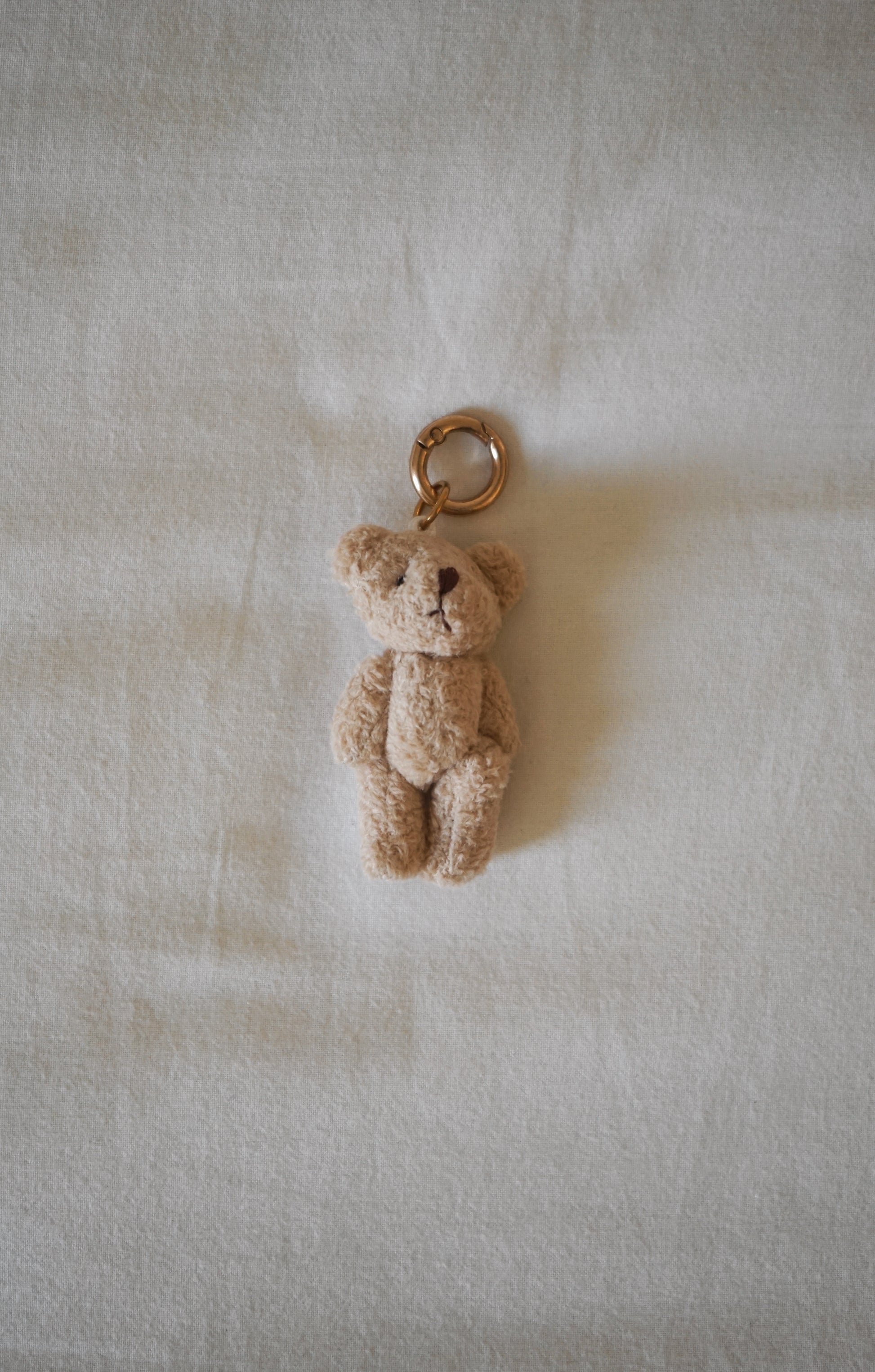 Le grigri ourson beige est accroché à son petit mousqueton rond.
